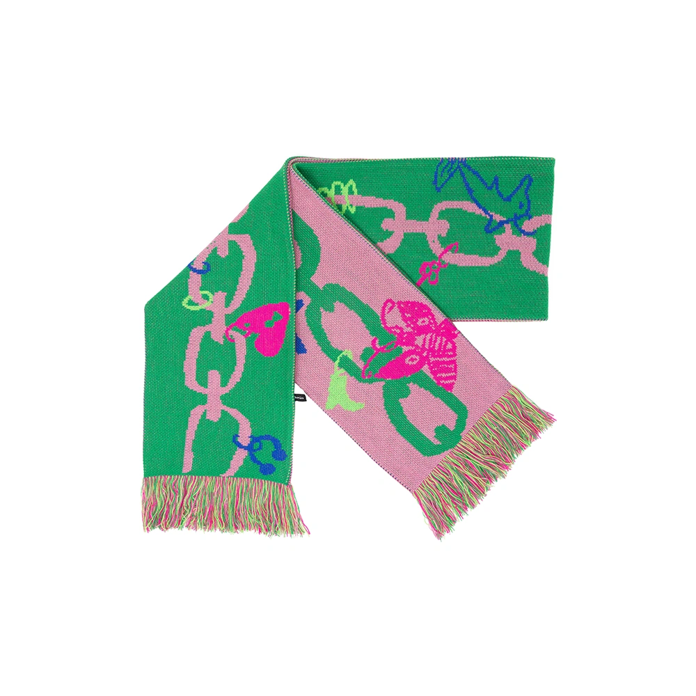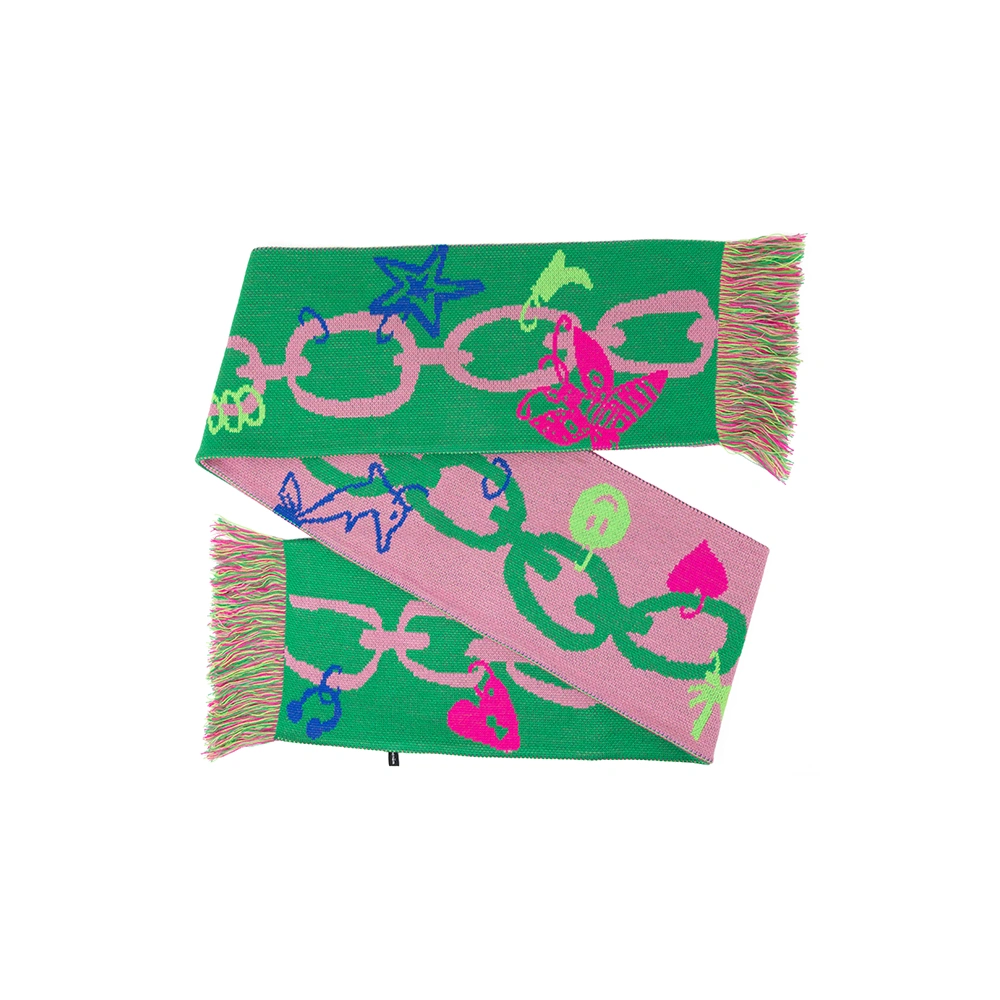 Dessus pendent des breloques qui claquent, des port-bonheurs qui brillent – cœur/clef/dauphin transforment l’écharpe en bijoux.