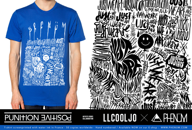 Au départ quand on a contacté LLCOOLJO nous connaissions son travail fascinant de touche à tout créatif, punk et sans concession. Nous lui avons laissé carte blanche. Il nous a directement proposé une punition, pratique qui l’obsède pas mal ces derniers temps…une fois l’idée acceptée, le coté « négatif » et « résigné » assez présent dans son travail fut évoqué, mais étant dans une période positive (chose assez rare chez lui pour le souligner) et aimant notre slogan « Just We aRe » il a choisi de faire une « punition positive ». Assez contradictoire nous direz vous mais pas plus que ça puisque certains aspects de sa personnalité y ressemblent sûrement.